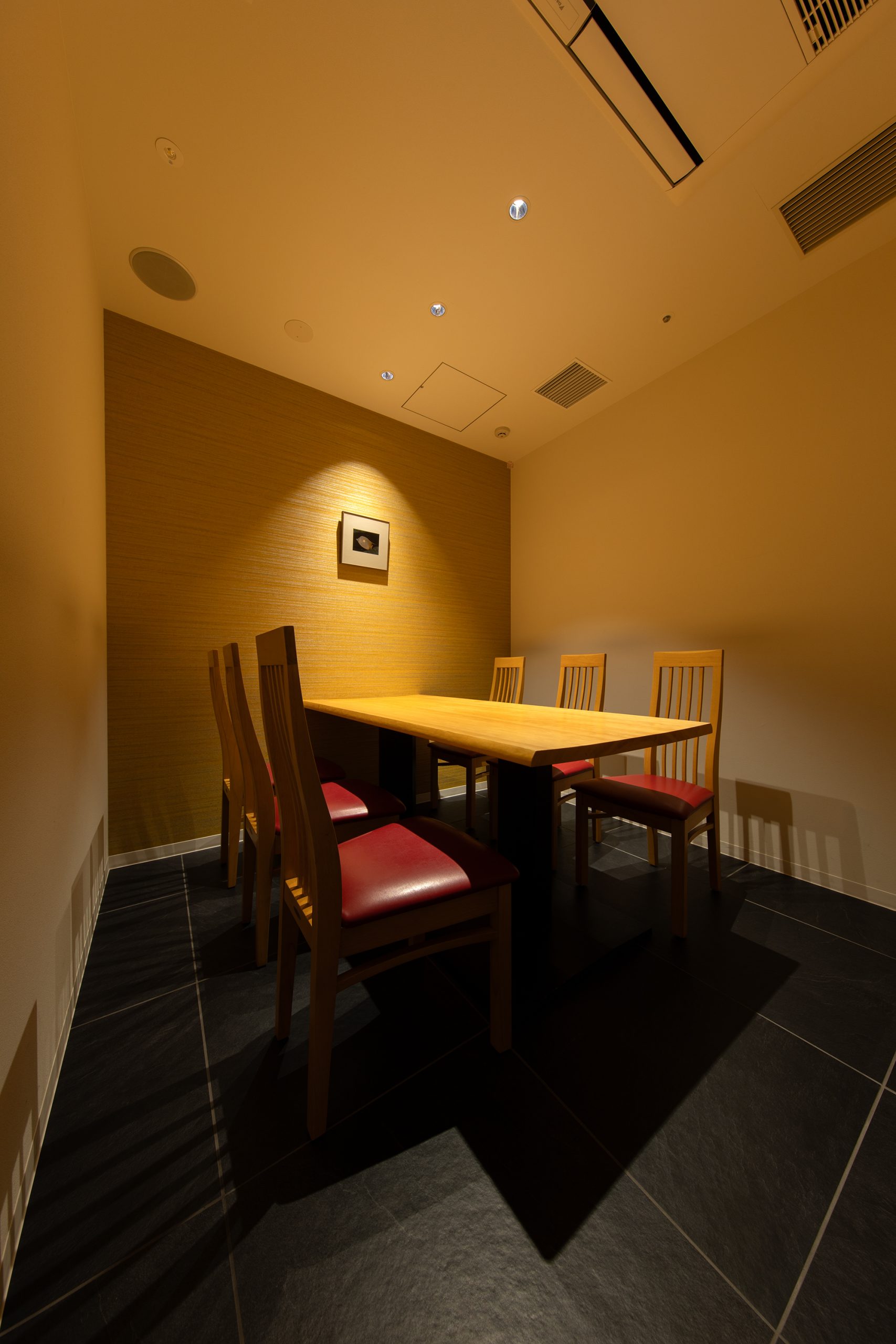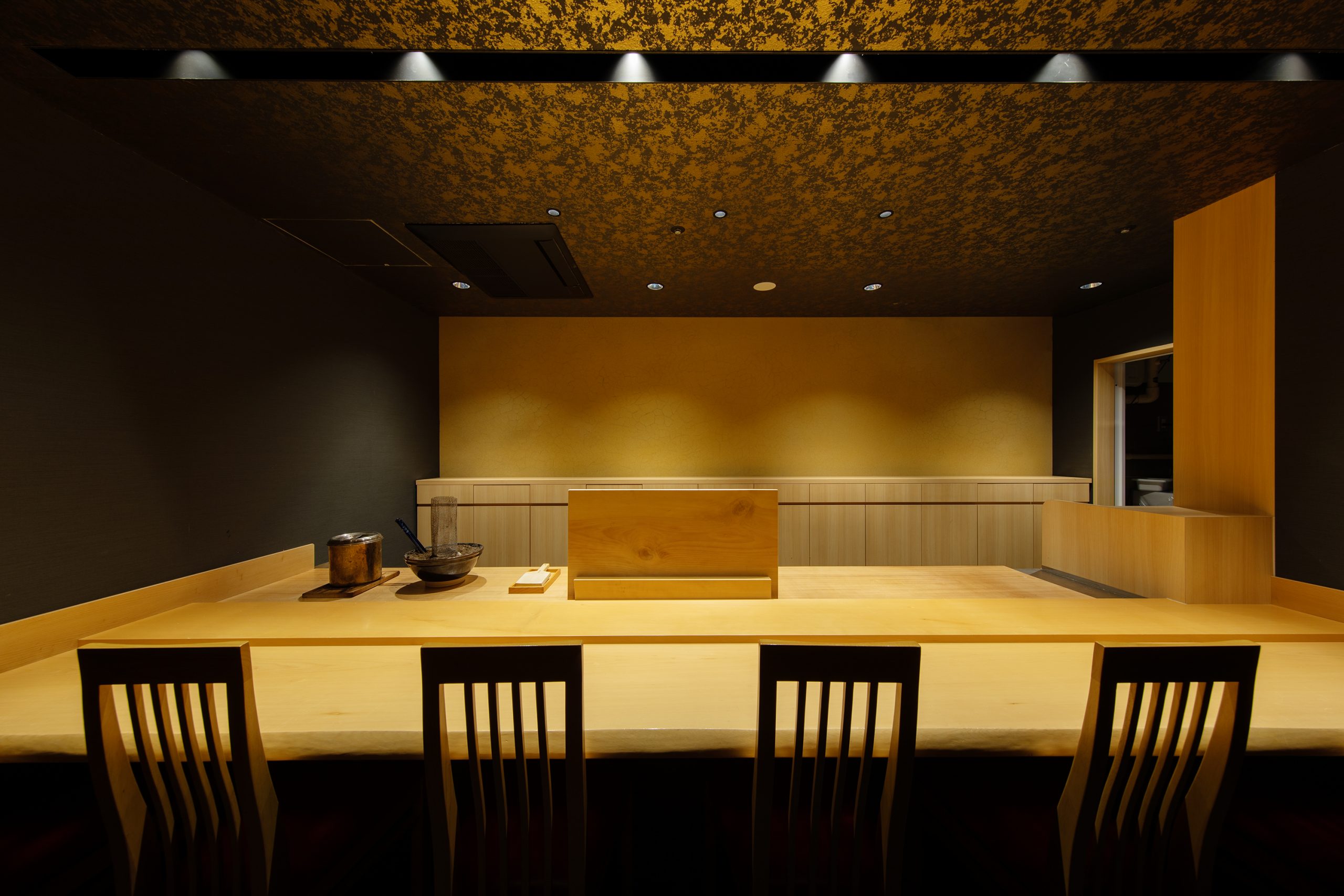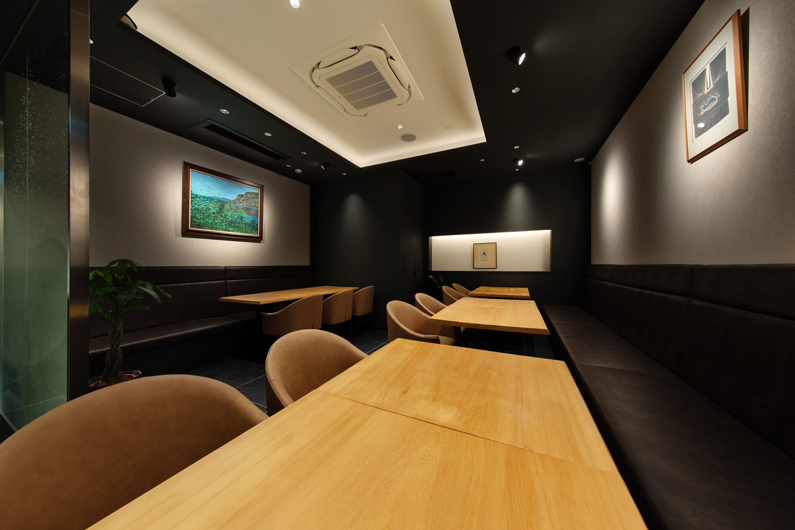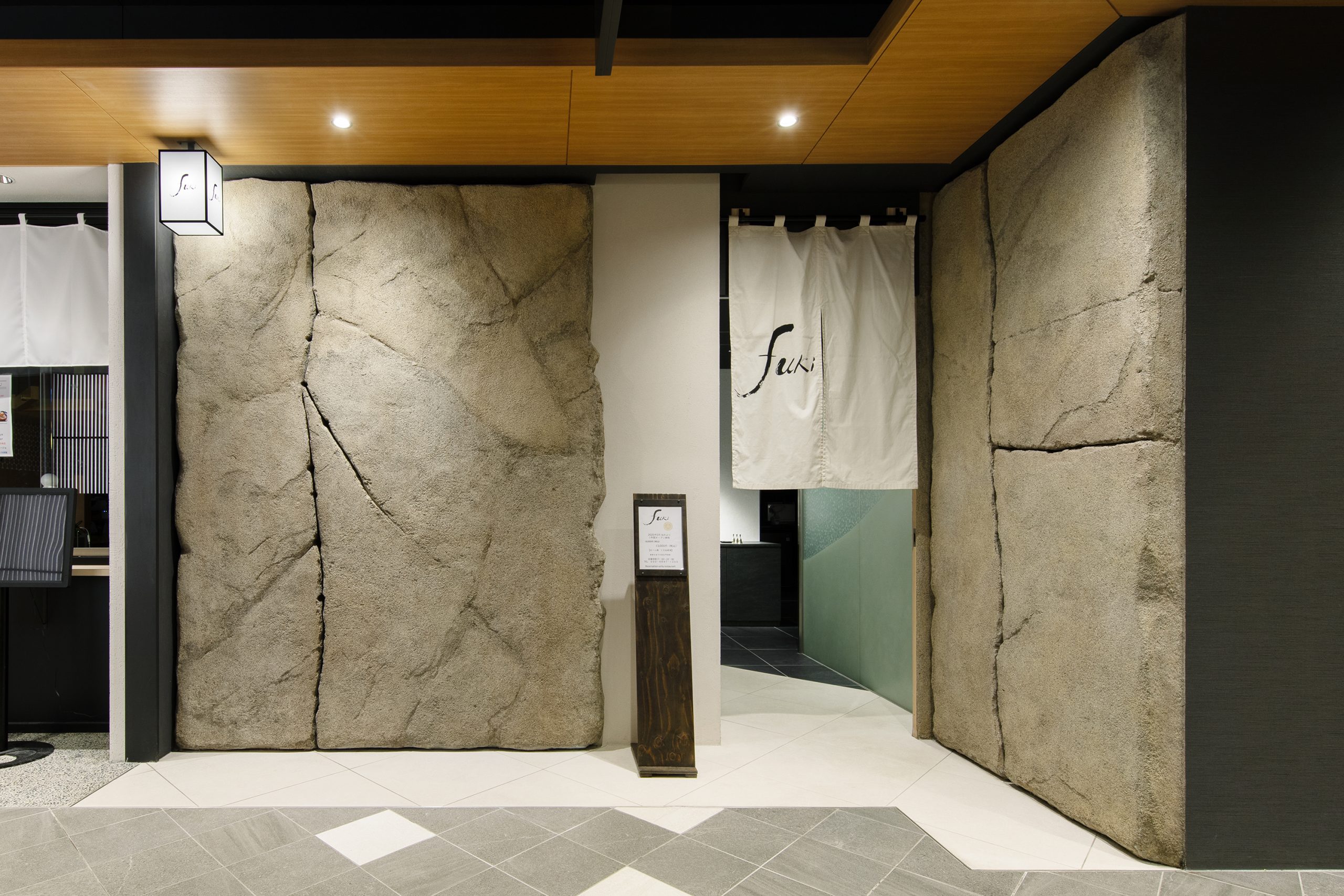 クロスゲート金沢2F同フロアにあるまっとう福喜壽司金沢店さんの別館として、完全予約制のお店を創りたい。居抜きのテナント工事という事も有り、既存の内装を上手く活かしながらゆったりとくつろげる空間へ改装をしたいとの要望でした。エントランスの正面に用いた和紙貼りは金沢店カウンターバックの和紙貼り壁面と繋がりを持たせると共に別館の顔となる様提案させて頂きました。店名ロゴがなかなか決まらず、一部工事が難航する場面も有りましたが、無事OPENを迎える事が出来ました。