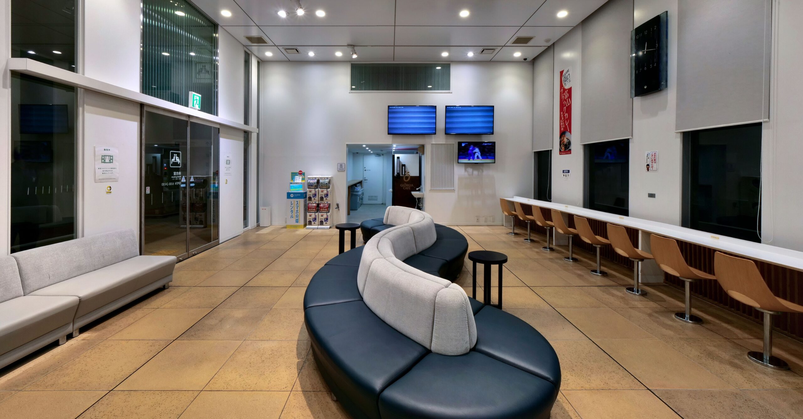 今回の改装では観光案内所や展示品販売の機能を残しながら集約して、待合スペースを1.5倍に広げ、ゆっくりくつろげるソファー席に変更しました。合わせて北陸新幹線の運行状況が見れる大型モニターを設置したり、授乳室を新設し利便性を高め、使いやすい空間を造る事が出来たと思います。
